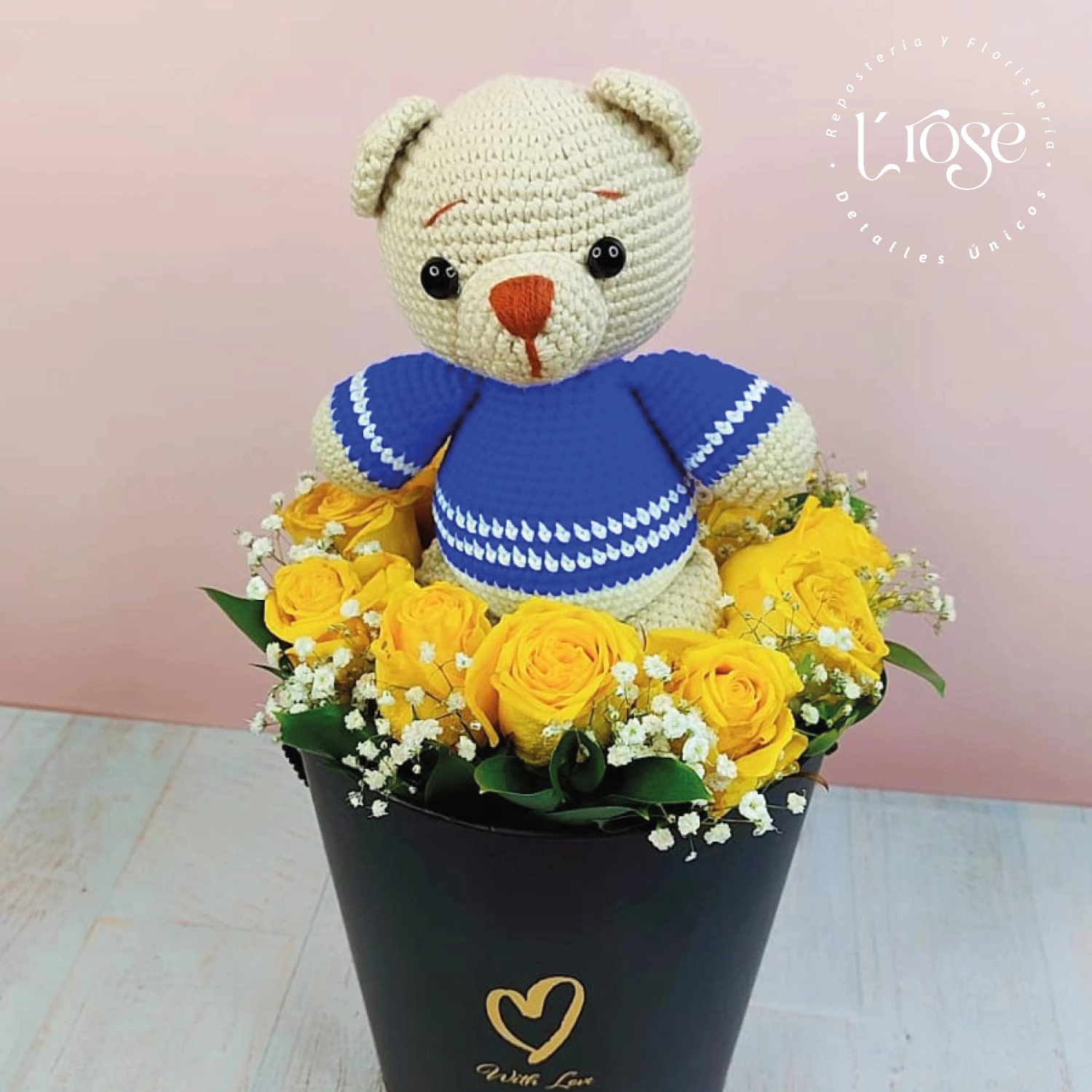 Caja cilindro con 12 rosas, yisofilia y amigurumi de 20 cm aproximadamente