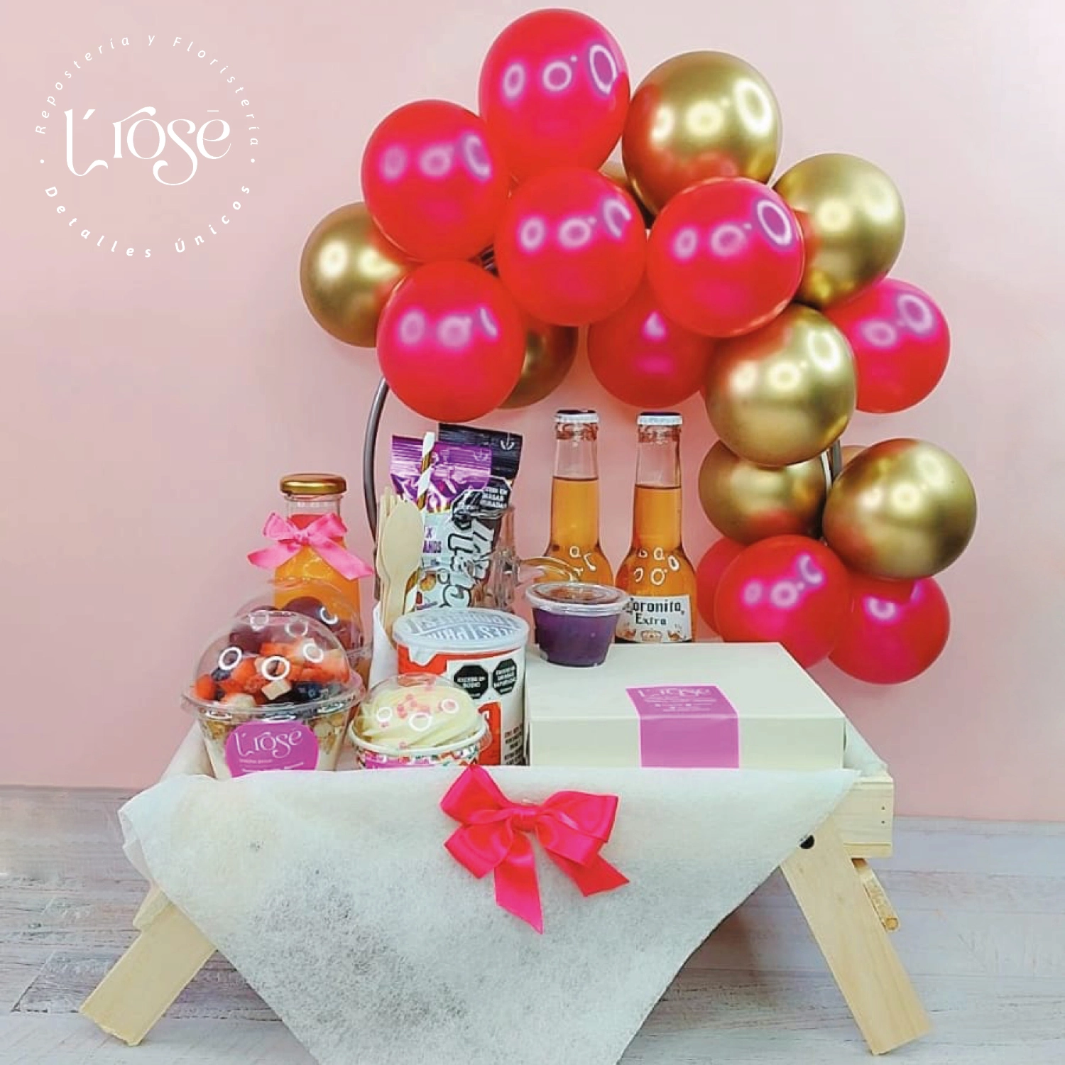 Desayuno de gofres rellenos de doble queso y jamón, mermelada de frutos rojos, parfait de frutas, cupcake, jugo de naranja o mandarina, fruta picada, 2 cervezas corona, vaso cervecero, 2 manís, pringles y cubiertos de bambu.