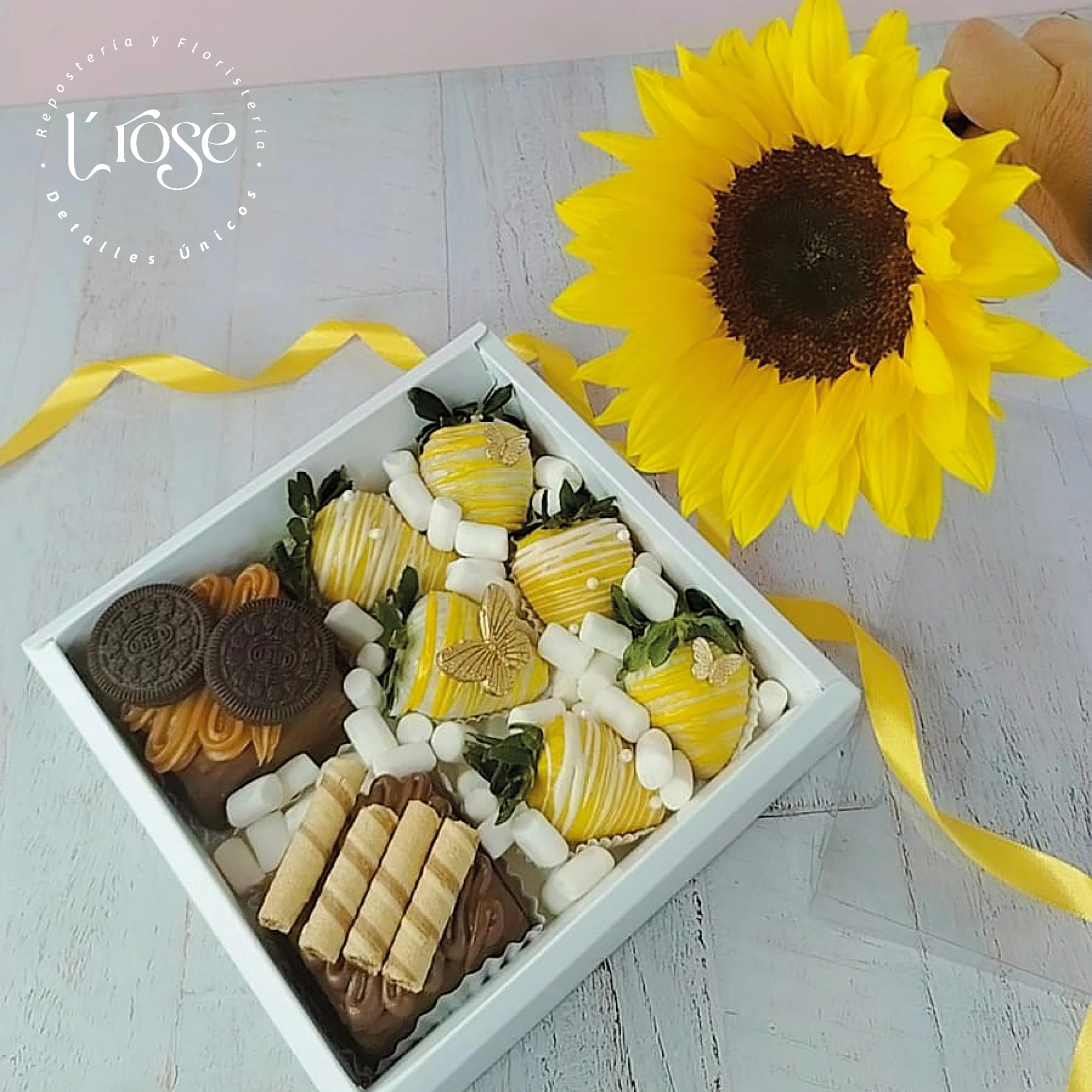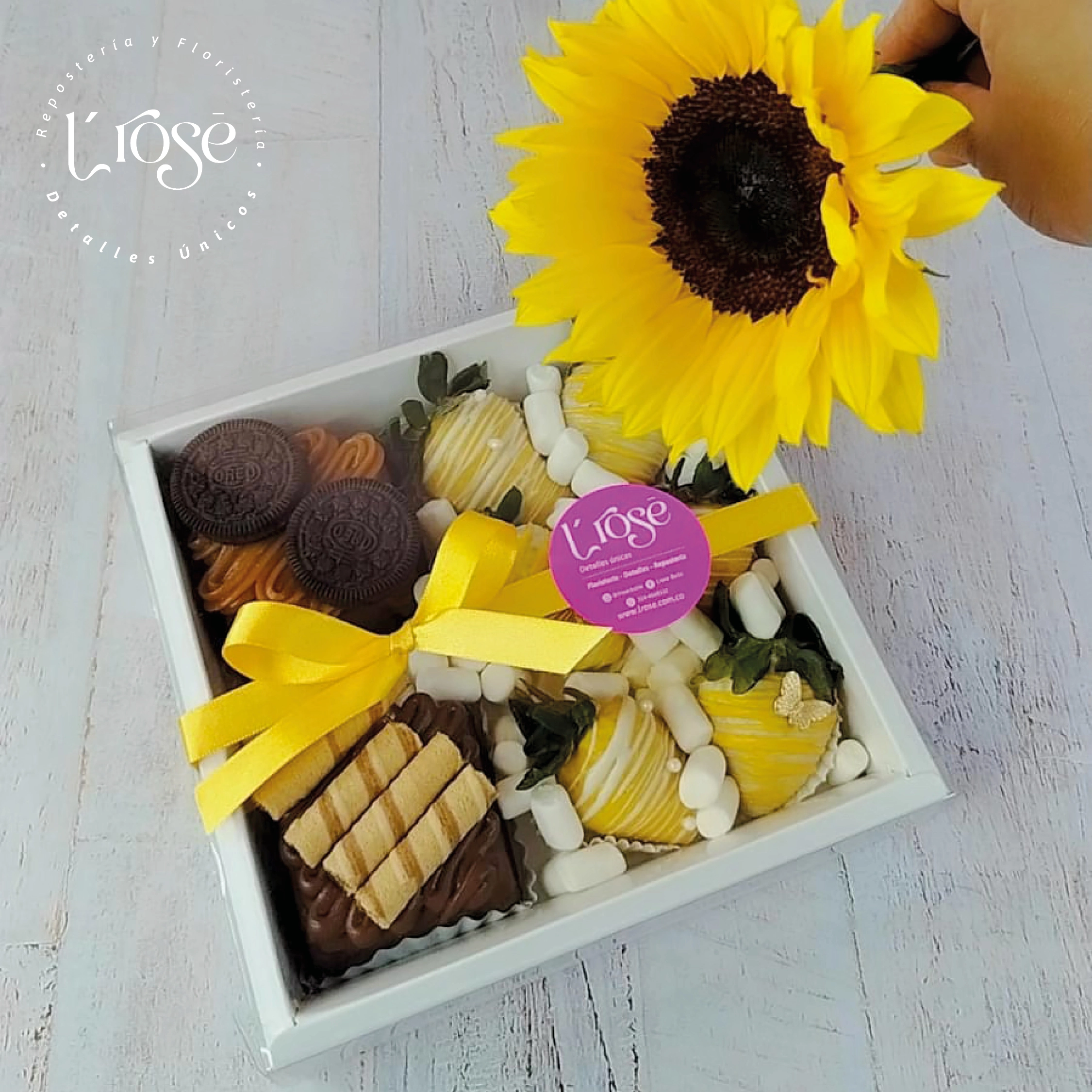 Caja con 2 brownies, 6 fresas con chocolate, mini masmelos y girasol