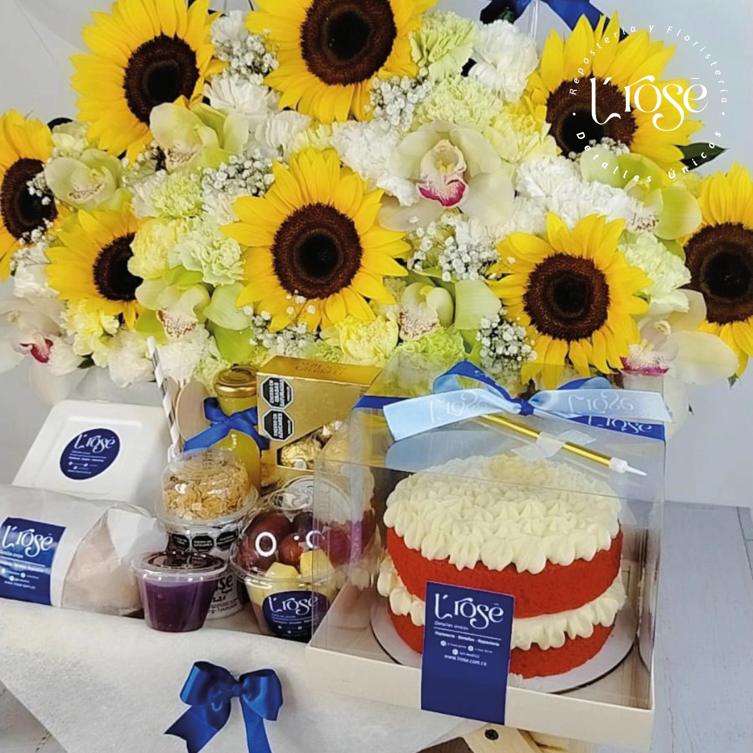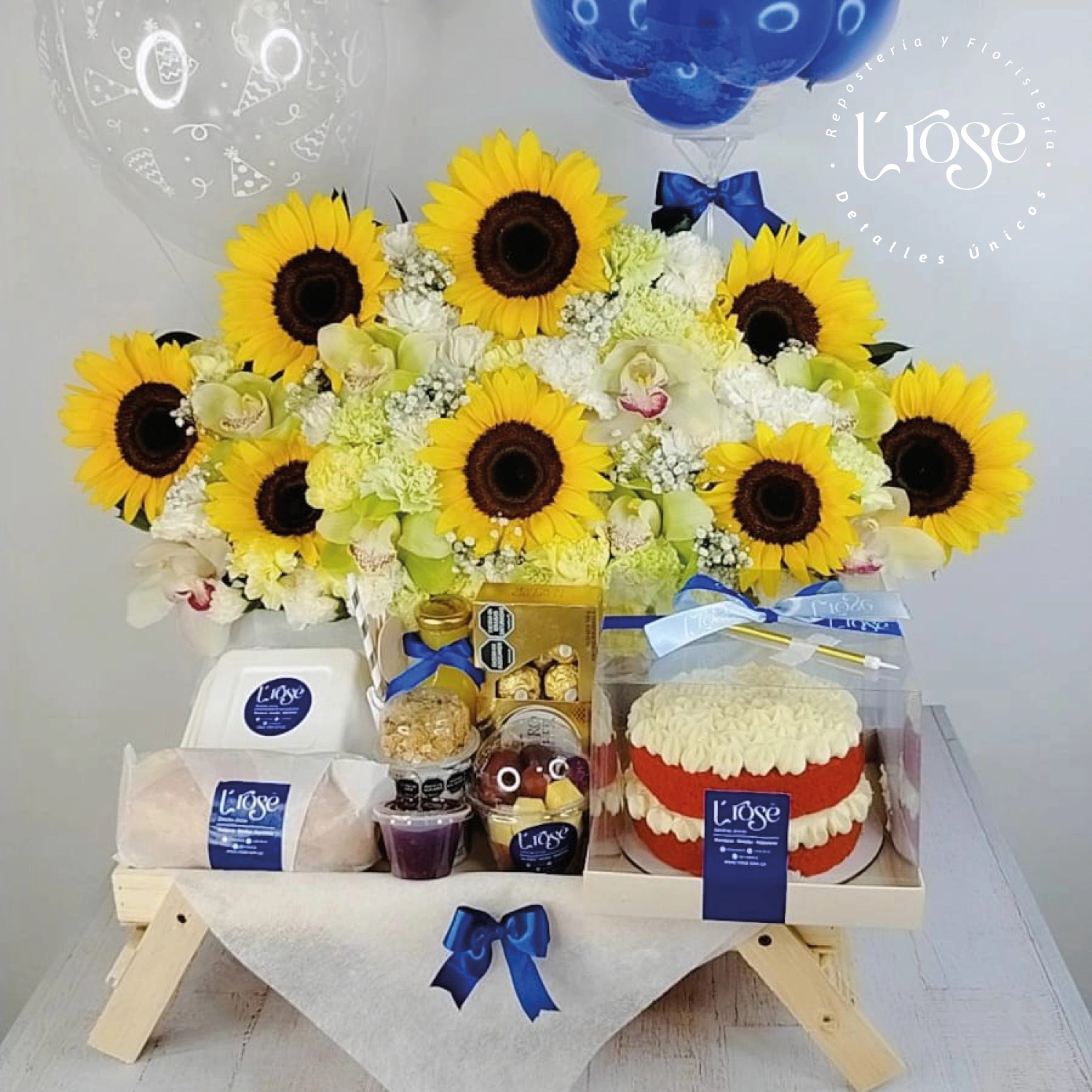Mesa con desayuno, arreglo floral de girasoles, claveles, orquídeas, globos con helio y globo burbuja con mensaje personalizable