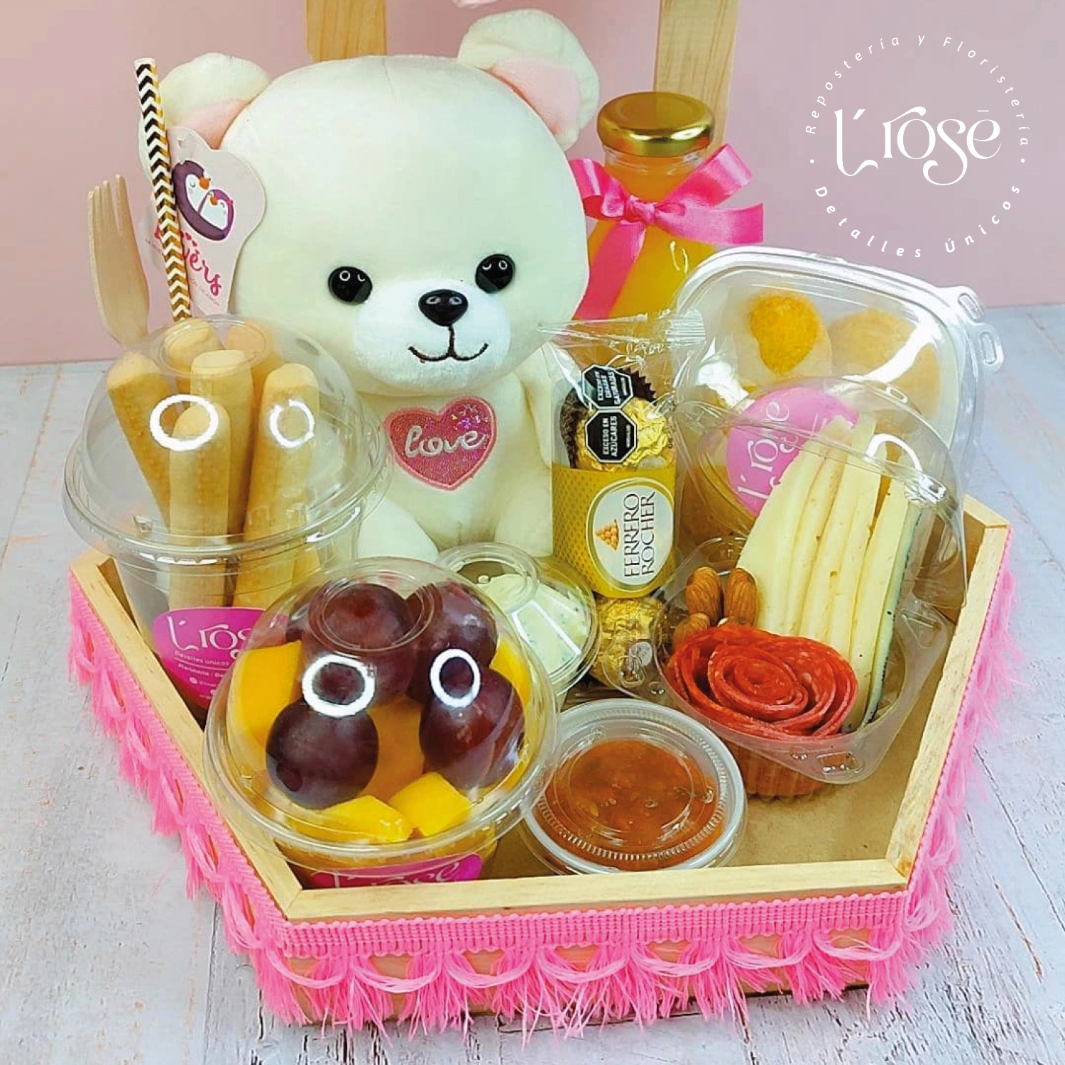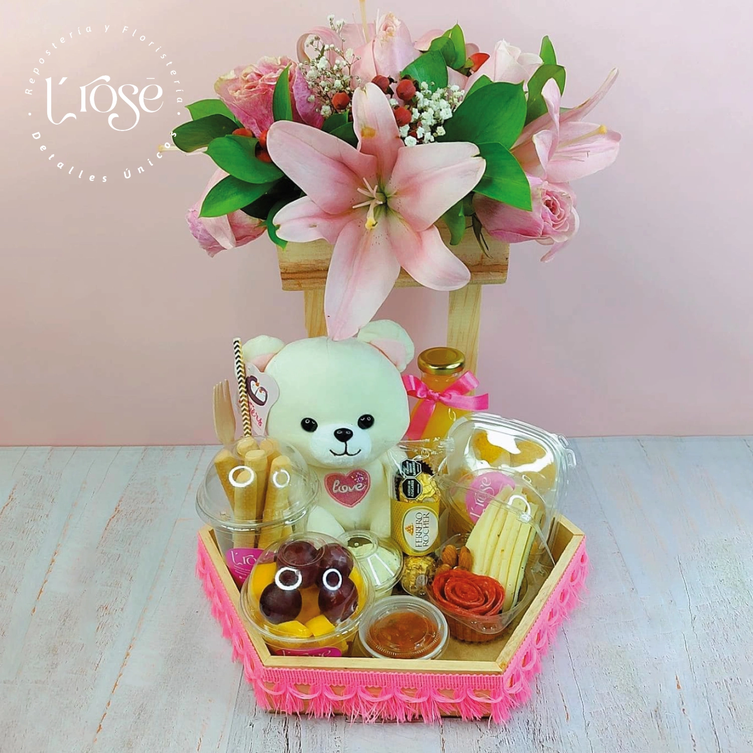 Desayuno de dos pisos hexagonal conarreglo floral de 12 rosas, 5 lirios, yisofilia, empirico y rusco, jugo de naranja, 5 palitriques, dip de queso (queso crema, miel, almendra y cilantro), fruta picada, Chocolates Ferreros rocher x 3 uds, mini tablita de quesos, 6 mini pasteles de pollo con picante, cubiertos de bambú, servilleta y peluche de 20cm.