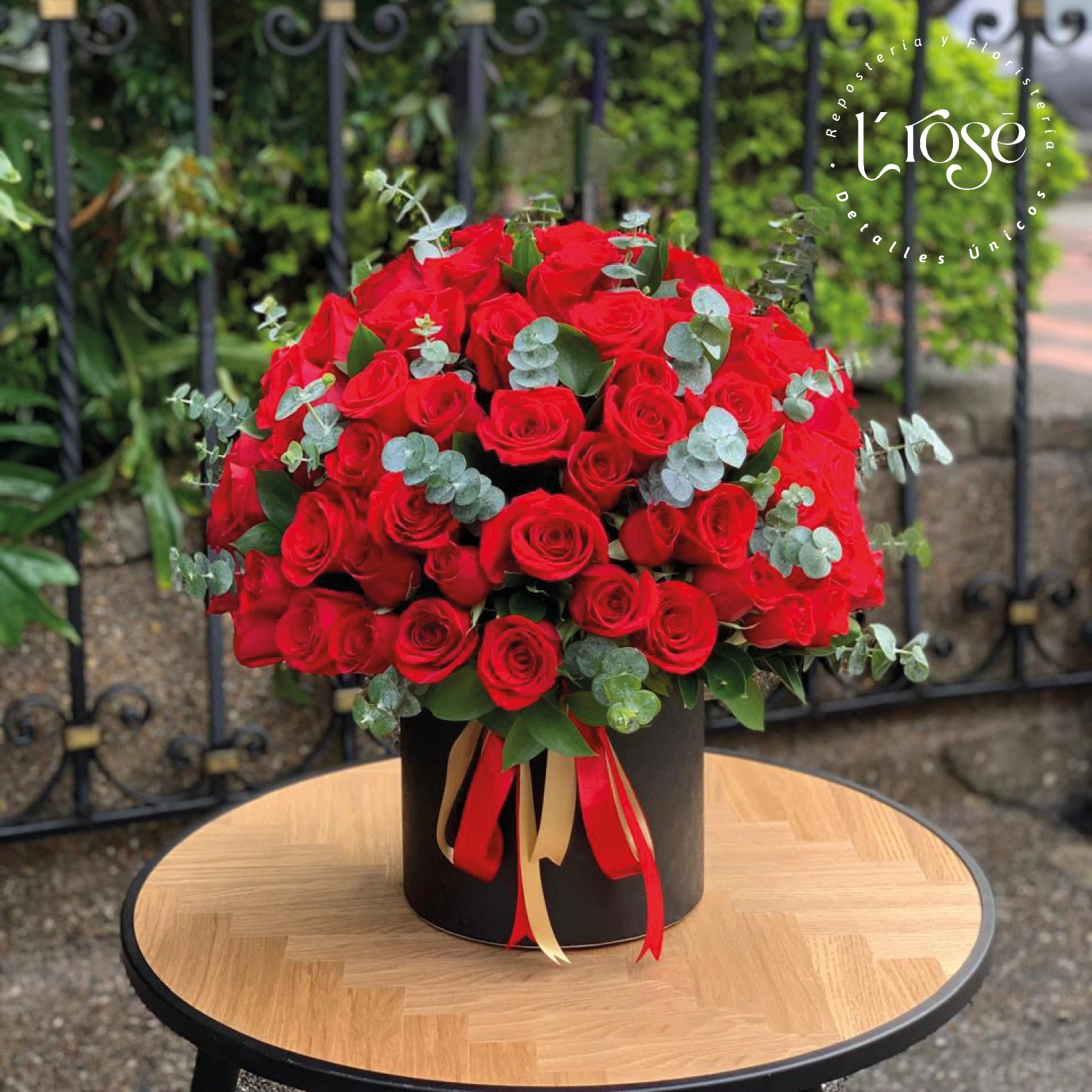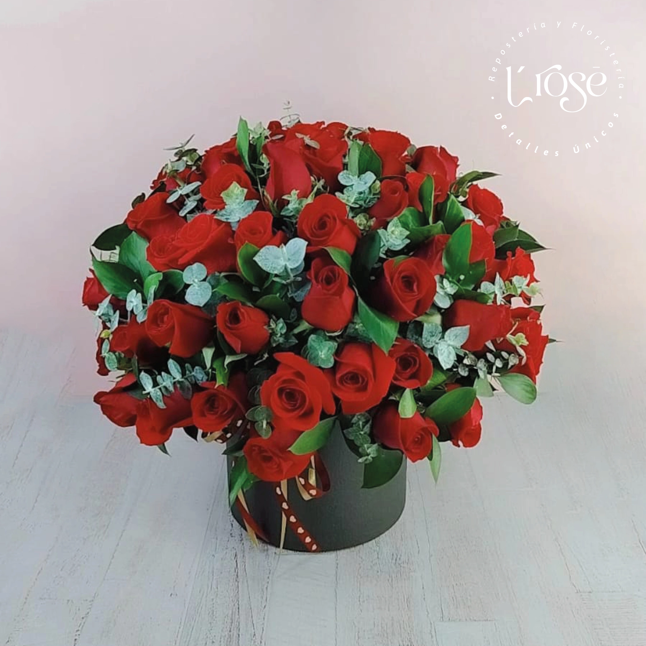 Caja cilindro con 72 rosas aproximadamente y eucalipto