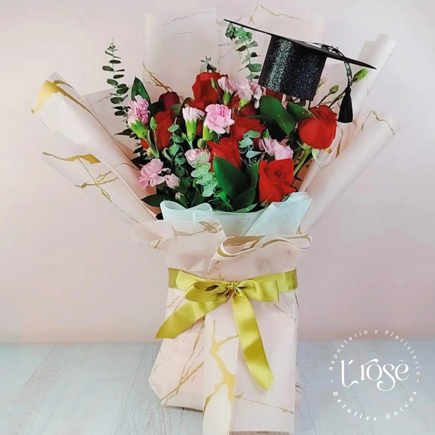 Bouquet de 12 rosas, clavellinas, eucalipto y birrete