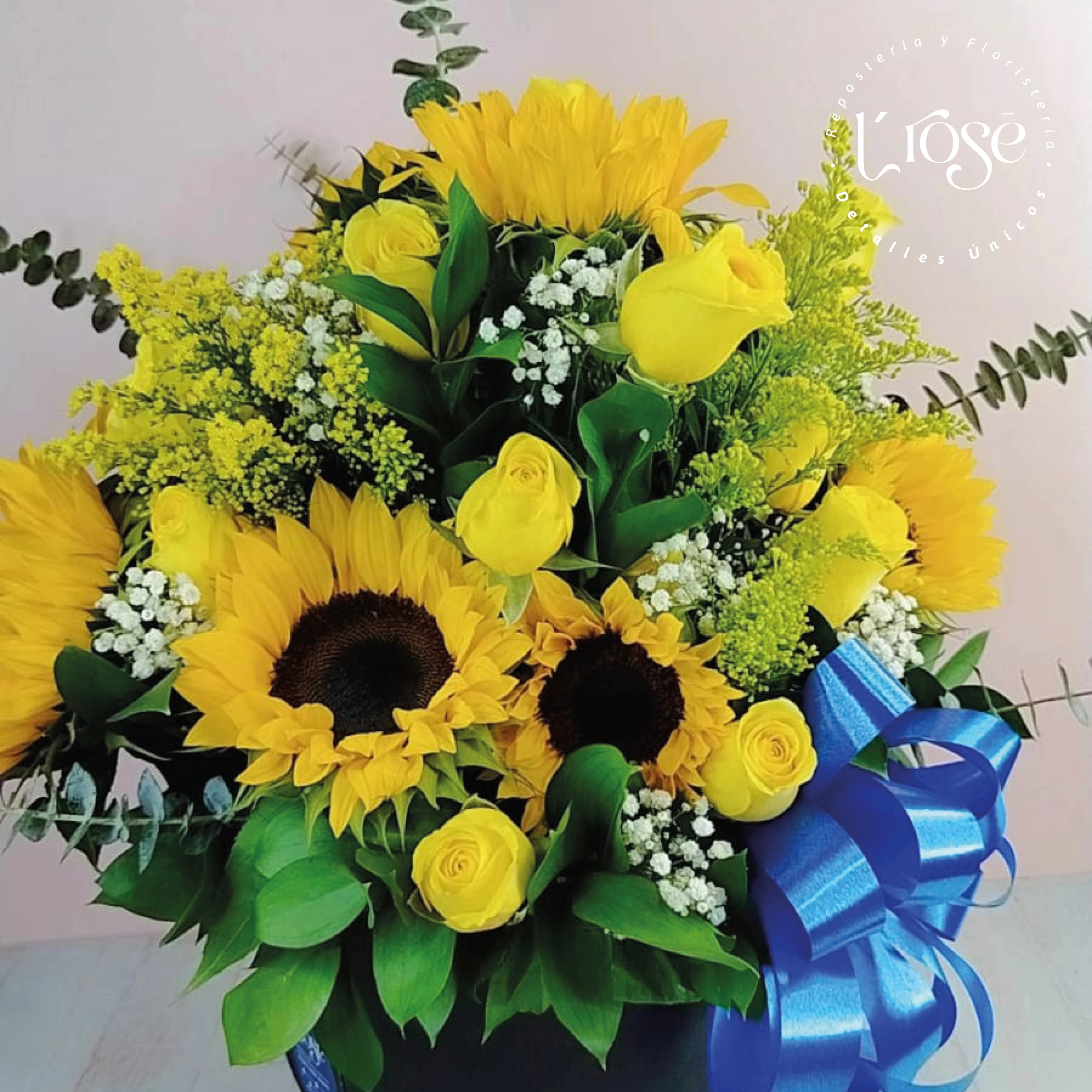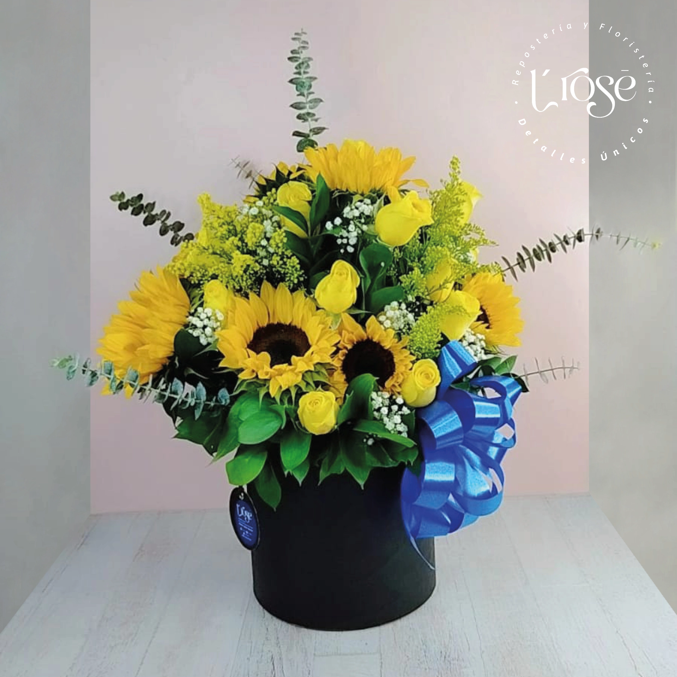 Caja cilindro con 11 girasoles, 18 rosas, solidago, eucalipto, yisofilia y 3 globos con helio