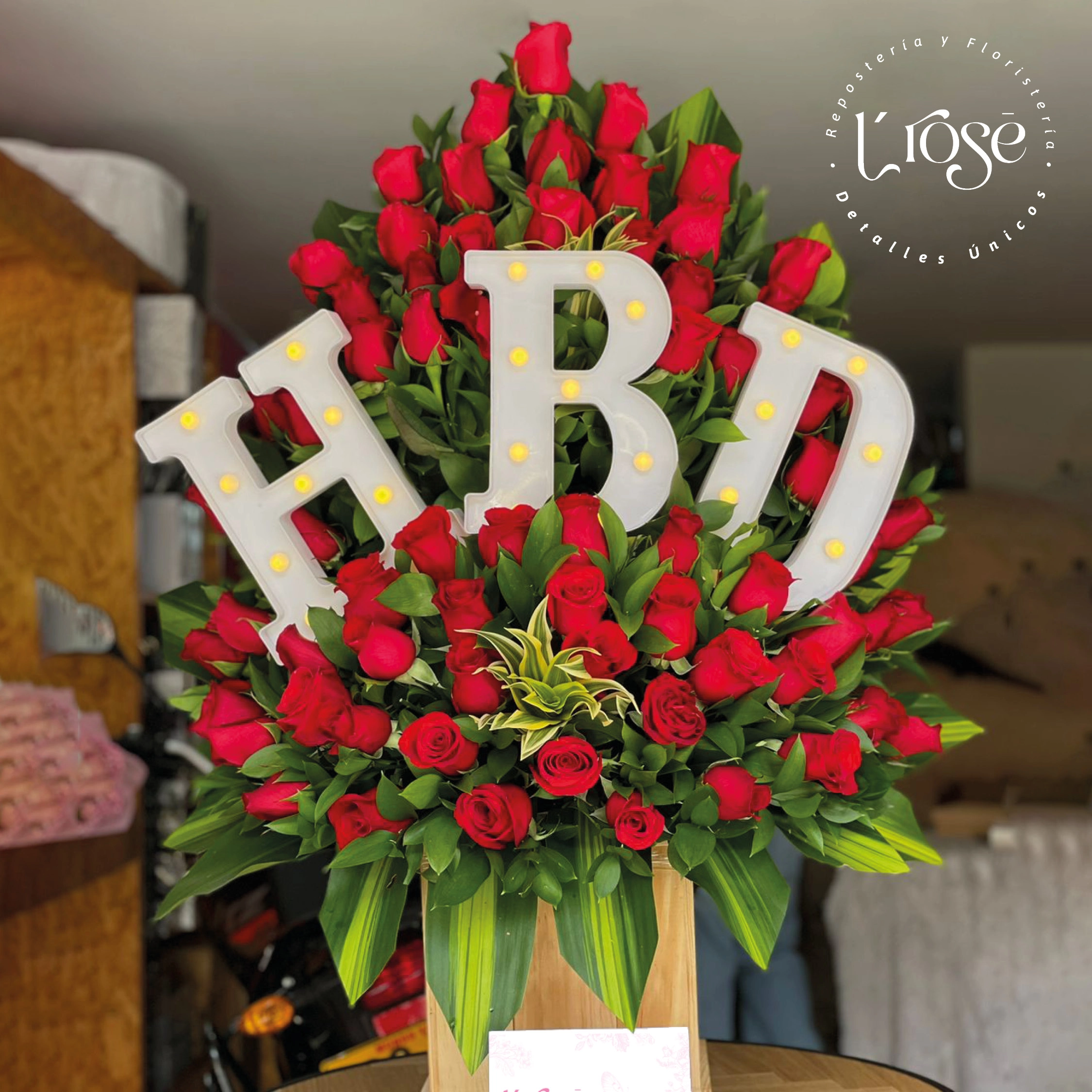 Arreglo de 72 rosas aproximadamente con letras de HBD con luces