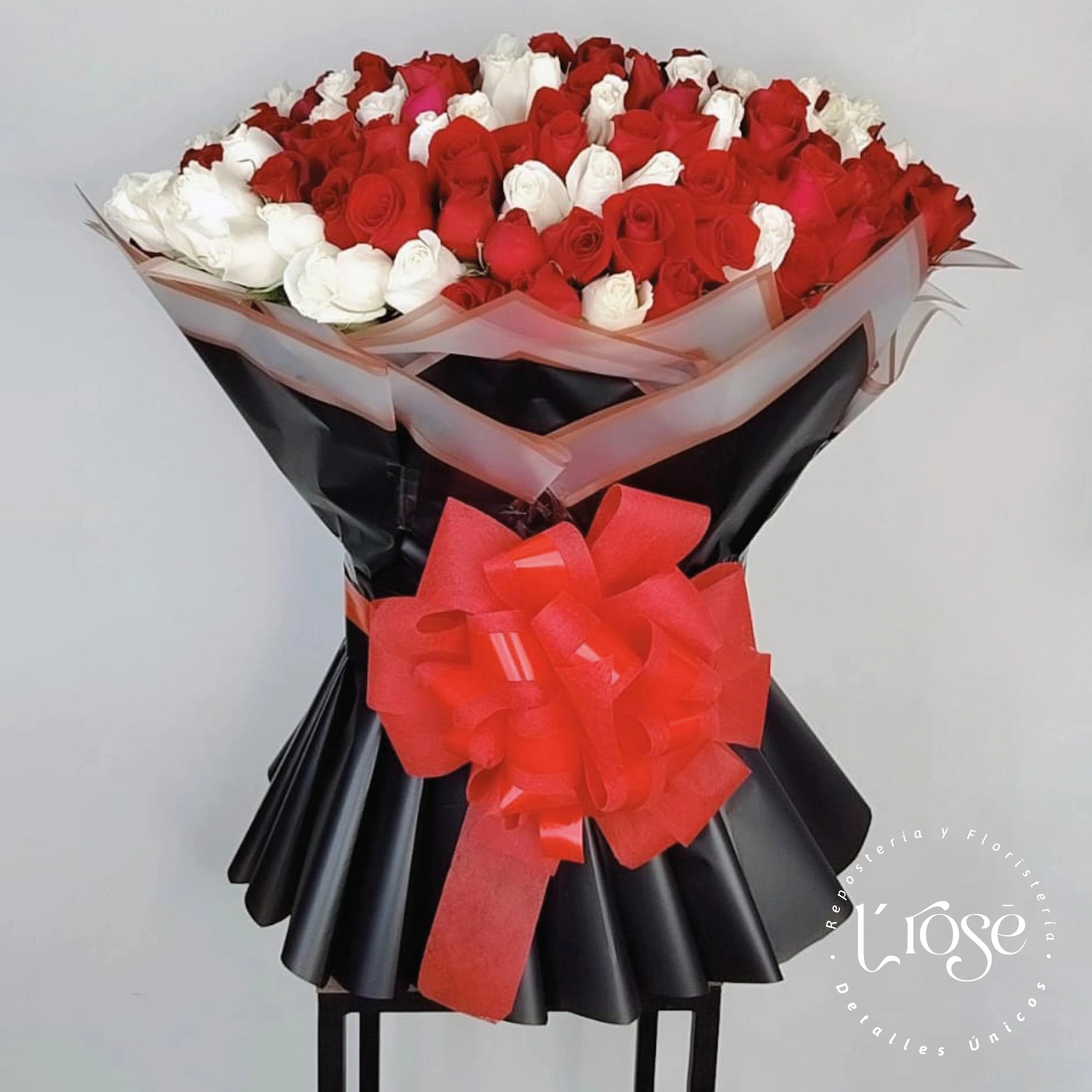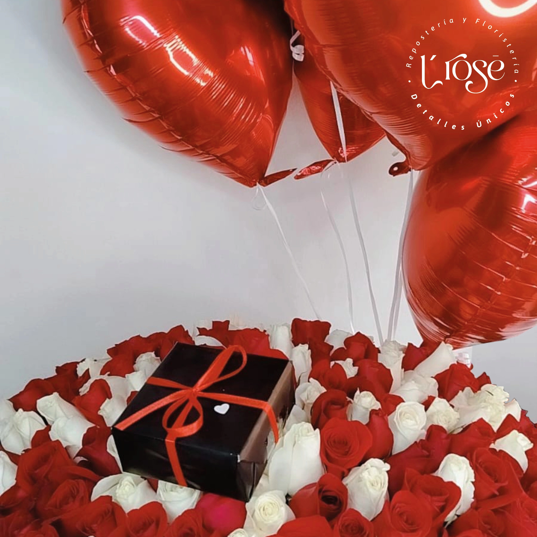 Bouquet buchón de 300 rosas Aproximadamente y 6 globos metalizados corazón