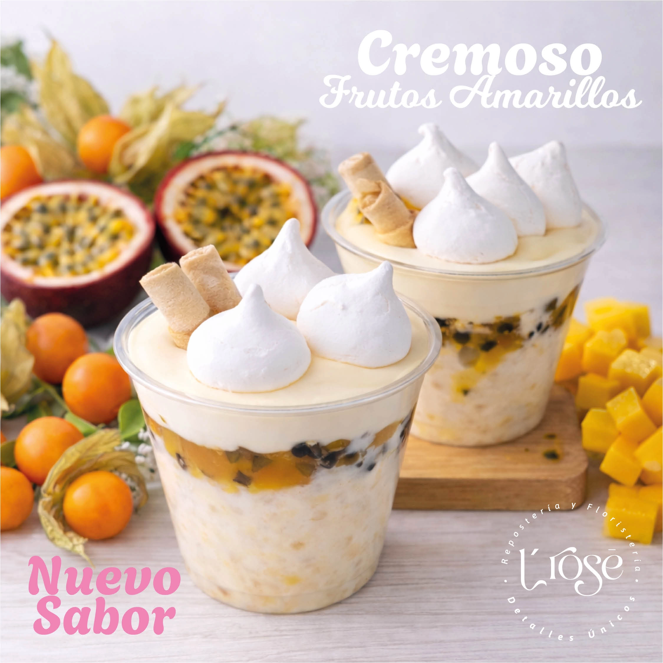 Capas de suave bizcochuelo remojado en tres leches se combinan con una deliciosa confitura de frutos amarillos (maracuyá, uchuva y mango), creando un balance perfecto entre dulzura y un toque cítrico irresistible.