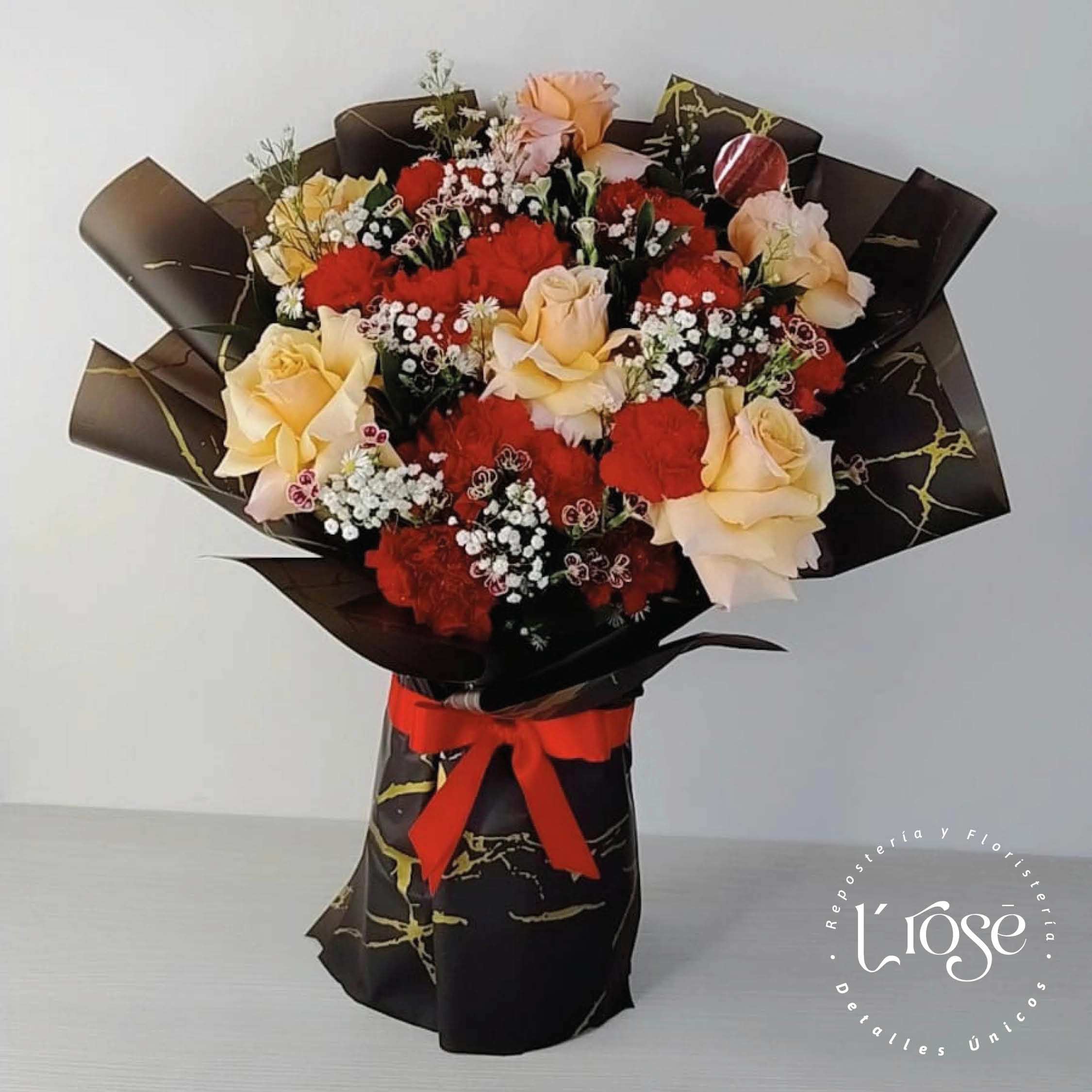 Bouquet con 6 rosas, claveles, aster, yisofilia y 5 globos con helio